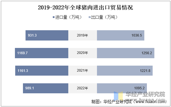 從進(jìn)出口商業(yè)環(huán)境來看,近年來全球豬肉進(jìn)出口規(guī)模全體呈增加的態(tài)勢(shì)。據(jù)材料顯示,2022年全球豬肉進(jìn)口量為989。1萬噸,同比下降14。8%;出口量為1095。2萬噸,同比下降10。4%。